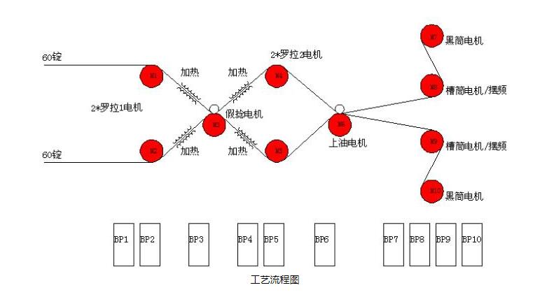 見下圖所示,120根人造纖維絲線分成兩組,每組各60根,通過羅拉1的牽引力使60個紗錠自由放線。經(jīng)過加熱、假捻、再加熱工藝后,由羅拉2牽引至下道工藝,經(jīng)過給假捻后的紗線進行上油工藝后,將紗線繞制成有利于放線運動的的120個紗錠,為后續(xù)深加工提供優(yōu)質(zhì)半成品。