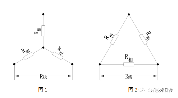 電機繞組星形連接時,示意圖如圖1所示,R線=2R相。
