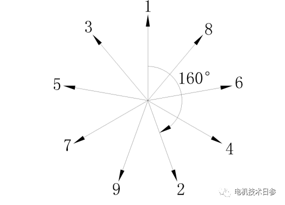 如圖1所示,為9槽、8極電機磁勢星形圖。