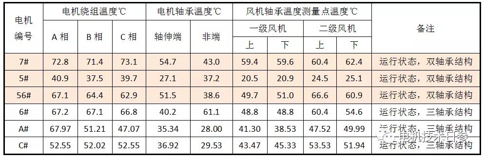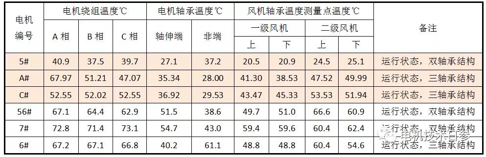 下表中,5#、A#和C # 3臺(tái)電機(jī)繞組溫度比較接近(A#電機(jī)繞組有相位偏差,與測點(diǎn)選擇不當(dāng)有關(guān))。5#電機(jī)的繞組溫度低于A#和C#電機(jī),關(guān)聯(lián)的風(fēng)機(jī)軸承溫度也相對(duì)較低,但5#和C#電機(jī)的軸承溫差相對(duì)較小,尤其是5 #和C #的數(shù)據(jù)對(duì)比更為明顯