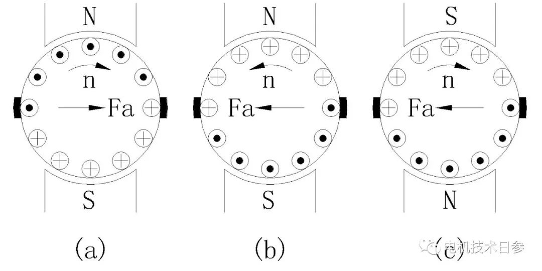 圖1給出了有刷永磁直流電動機正反轉原理。圖1(a)中磁極下電樞電流分布情況下,利用左手定則或比奧·薩乏定律可知,電樞將按順時針方向轉動。如果改變電樞電流方向,使其產生的電樞磁場與圖1(a)中的方向相反,即轉過去180o電角度,如圖1(b)所示,則電樞將按逆時針方向轉動。若保持圖1(b)中的電樞電流的方向不變,而把定子磁場旋轉180o電角度,如圖1(c)所示,則電樞又將按照順時針方向轉動。