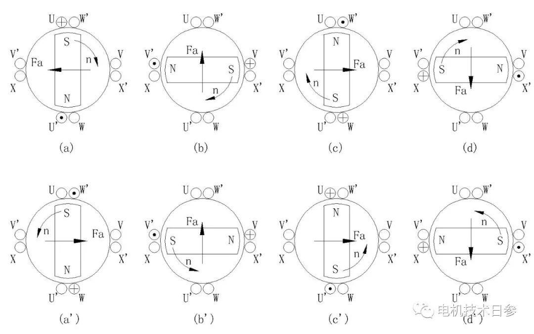 此時順時針與逆時針旋轉的轉子磁極轉向相反方向,即轉子磁場互差180o電角度,定子電樞磁場同方向才能使逆時針旋轉的轉子磁極旋轉的磁極繼續逆時針方向旋轉。故同為UV去驅動V相繞組,使V相繞組通電,實現了由狀態(b)到(b’)的切換。