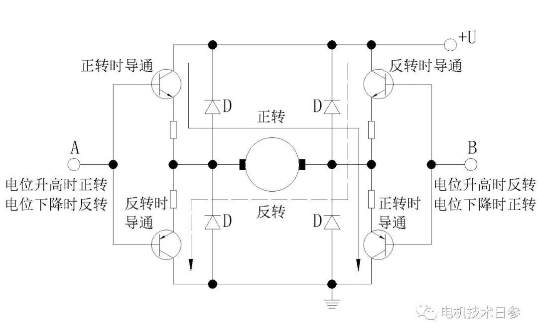 ● 采用一套轉子位置傳感器,借助邏輯電路改變功率開關晶體管的導通順序,從而實現電動機的正反轉。