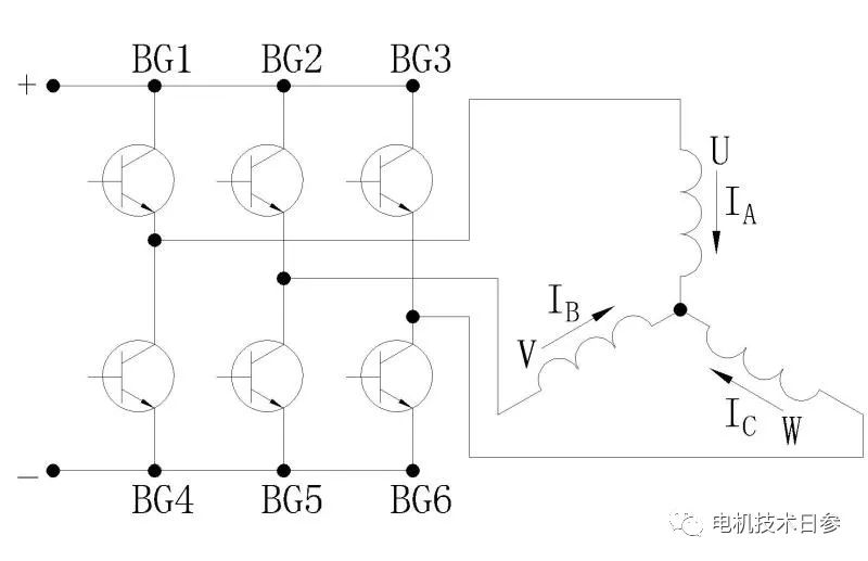 以如圖1所示“三相星形橋式連接”換向電路為例,看一看“二相導通星形三相六狀態”的電子換向過程:
