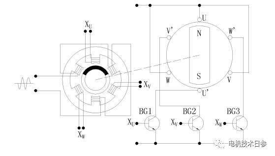 ● 當旋轉部分的高頻鐵氧體磁芯(圖中涂黑部分)扇形片使副邊輸出線圈XU與原邊激磁線圈耦合時,副邊輸出線圈XU就有輸出信號;而其他兩個副邊輸出線圈XV和XW沒有與原邊激磁線圈耦合,所以沒有輸出信號。這時利用副邊輸出線圈XU的輸出信號經整流處理后去觸發與U相電樞繞組相連接的功率開關晶體管BG1,并使之導通,功率開關晶體管BG2和BG3因沒有觸發信號而保持截止狀態,電源給U相電樞繞組供電。