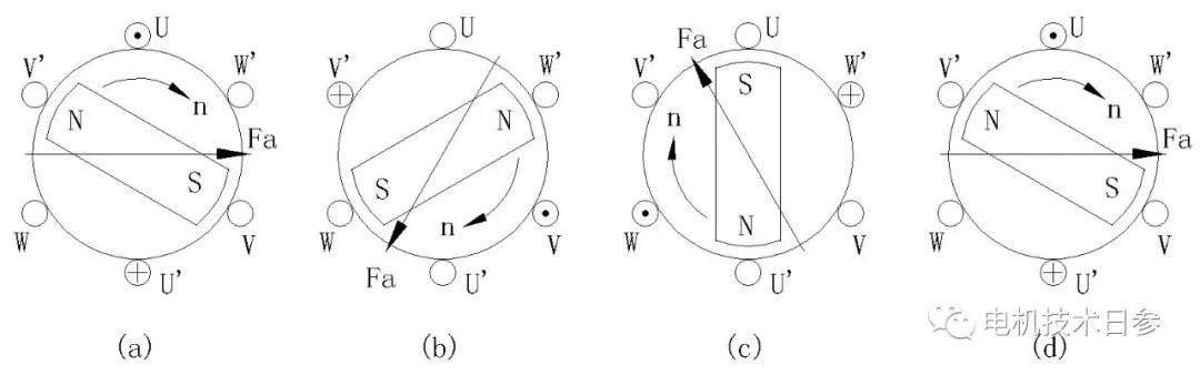 圖8(a)為磁狀態,Fa為電樞繞組被饋電后所產生的磁勢。顯然,電樞磁場與永磁體磁場的相互作用迫使電動機轉子沿著順時針方向旋轉;當轉子轉過120o電角度后,便進入第二磁狀態,如圖8(b)所示,電動機轉子繼續沿著順時針方向旋轉;當轉子再轉過120o電角度后,便進入第三磁狀態,如圖8(c)所示,電動機轉子繼續沿著順時針方向旋轉;當轉子再沿著順時針方向轉過120o電角度后,電動機便回到起始狀態,這樣周而復始,電動機便連續不斷地旋轉。