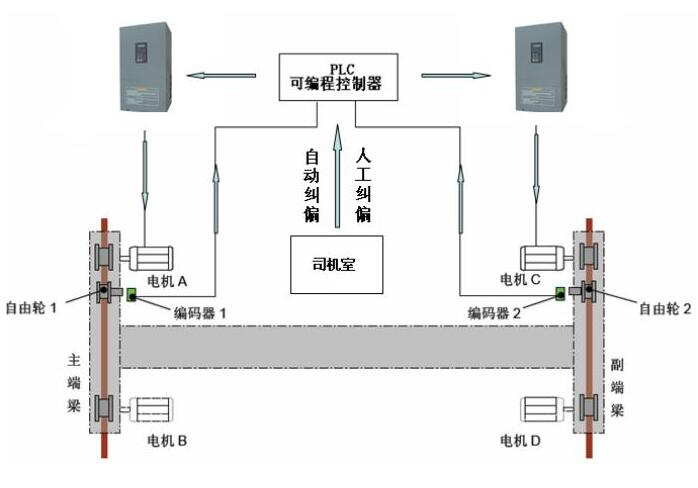 3、起重機(jī)大車兩側(cè)隨動輪上安裝絕對編碼器,編碼器位置信號給入PLC,PLC邏輯處理。